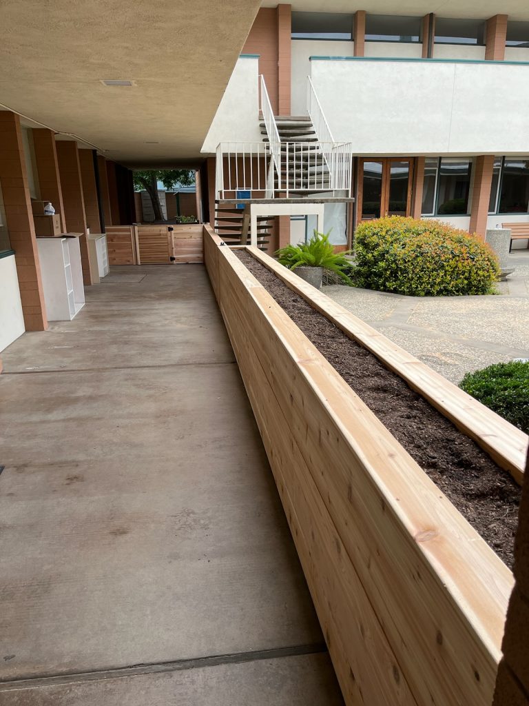 Done for a local church and preschool, you will notice we built this beautiful cedar fence to double as a planter box. It feels as sturdy as it looks! It will undoubtedly last for years to come, despite the heavy foot traffic of parishioners and school children. This entire project took us 3 days to complete.